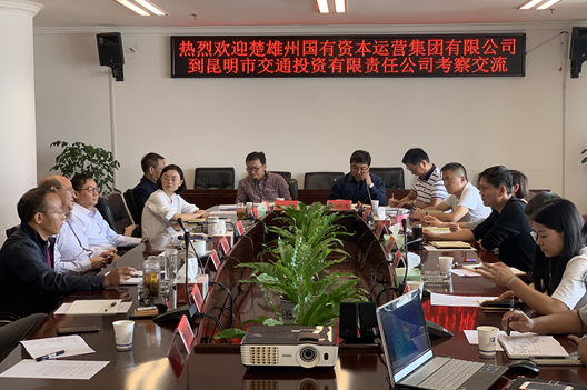 9月10日,楚雄州国有资本运营集团有限公司董事长祖凌携公司主要领导及下属公司一行12人莅临昆明市交通投资有限责任公司进行考察交流。交投公司董事长雷升逵、副总经理许哨、黎兴宏及相关部门负责人参加座谈会。