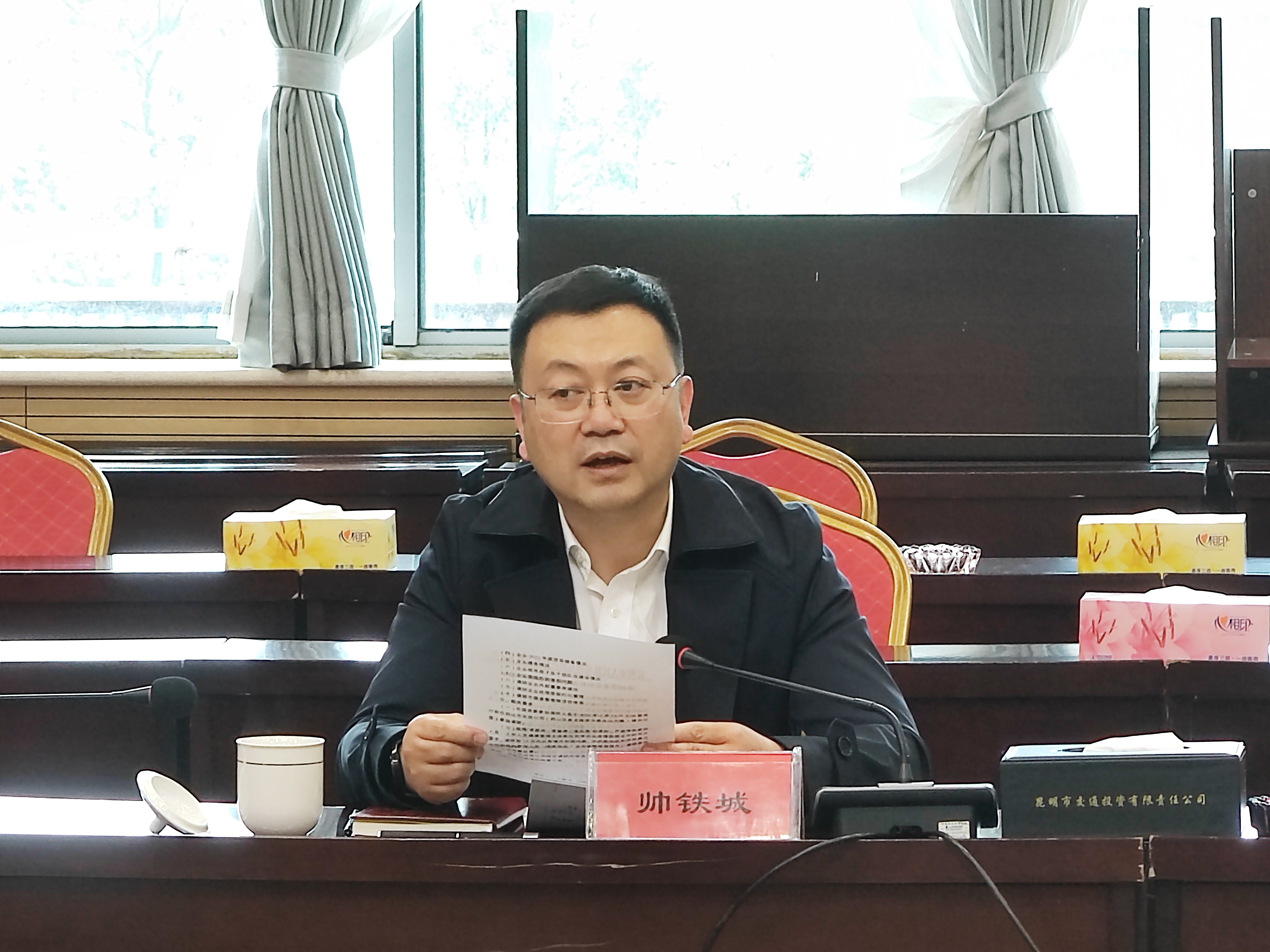 为进一步了解市属国有企业生产经营情况,2022年3月24日上午,由昆明市国有资产监督管理委员会(以下简称“市国资委”)副主任帅铁城带队,到昆明市交通投资有限责任公司(以下简称“昆明交投公司”)开展调研。市国资委副主任倪云丰、宋昱旸、邱兰,资本运营处、考核分配处、企业领导人员管理处、政策法规处、财务监督处、办公室负责同志;昆明交投公司领导班子、资本运营部、财务管理部、投资管理部、人力资源部、董事会工作部、党群工作部、综合管理部负责人参加会议。