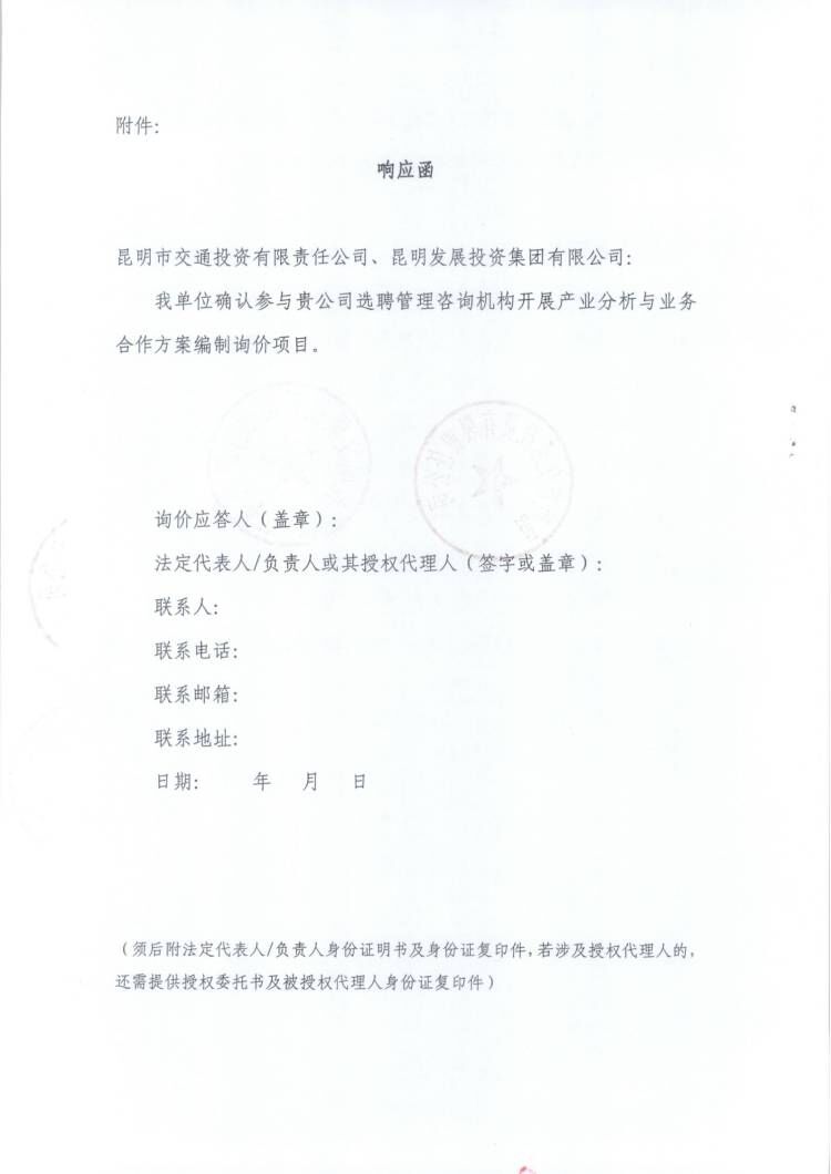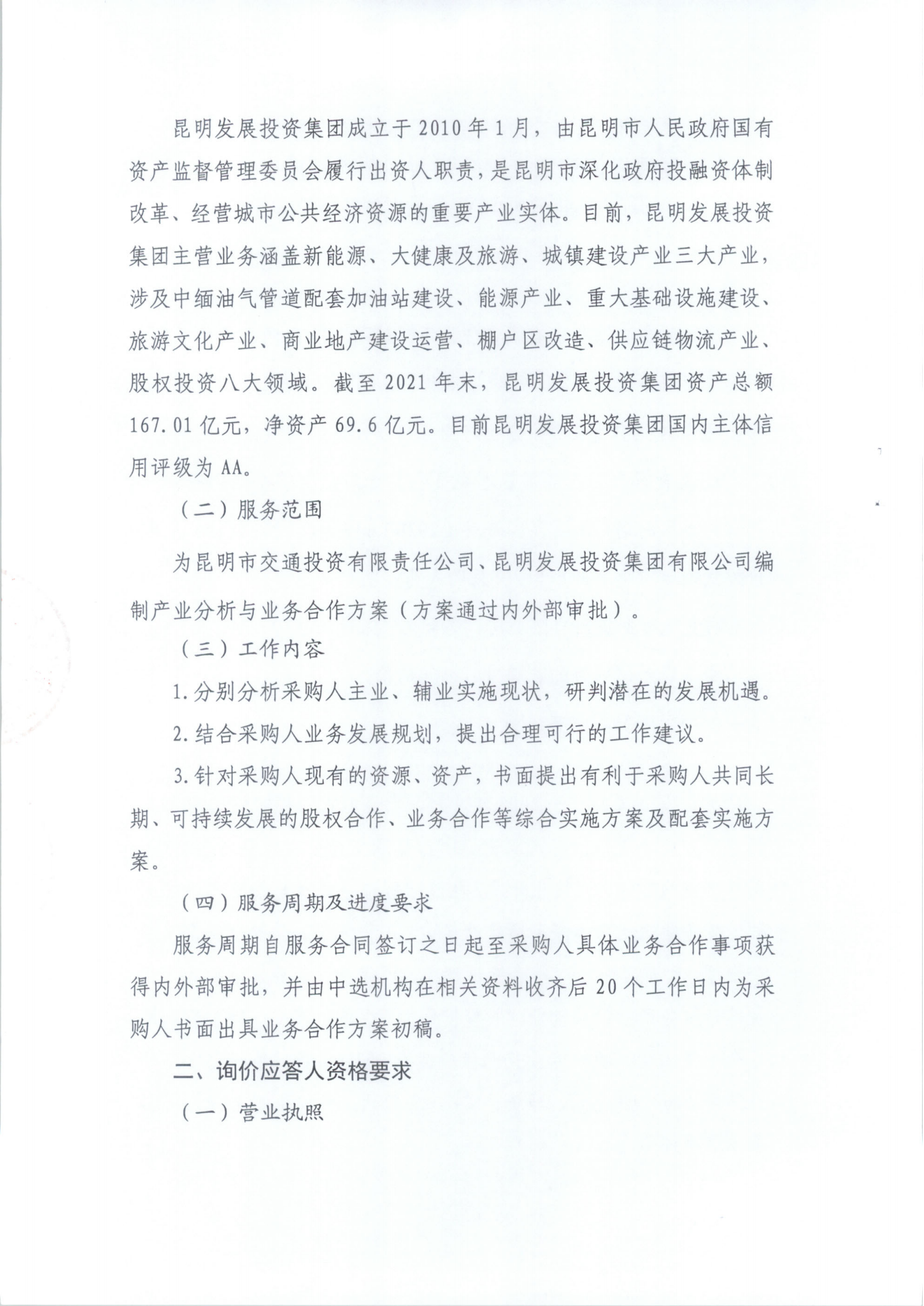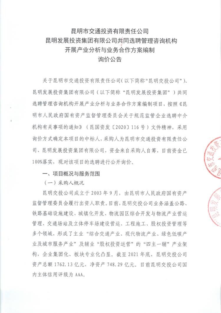 昆明市交通投资有限责任公司昆明发展投资集团有限公司关于共同选聘管理咨询机构对开展产业分析与业务合作方案编制询价公告