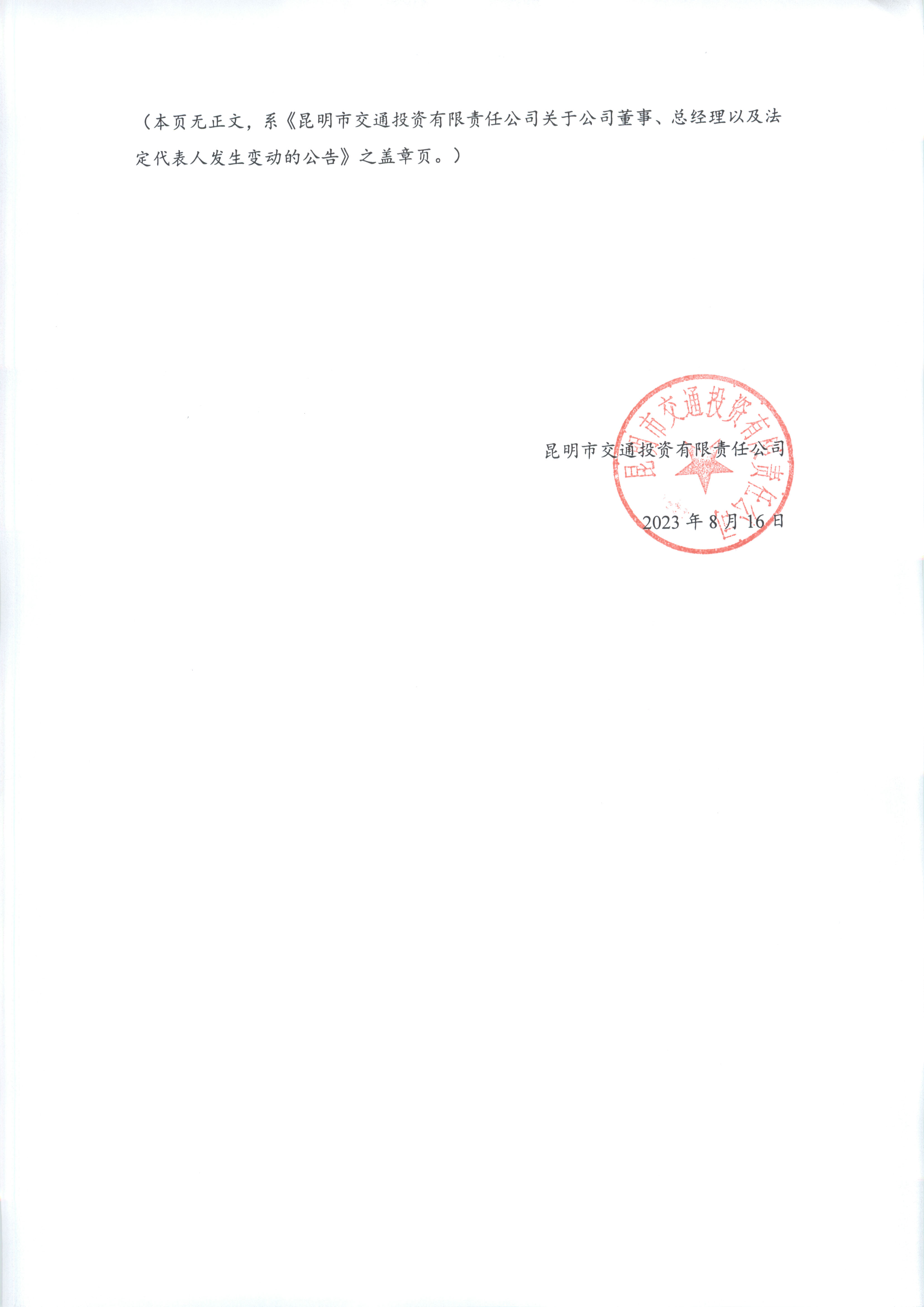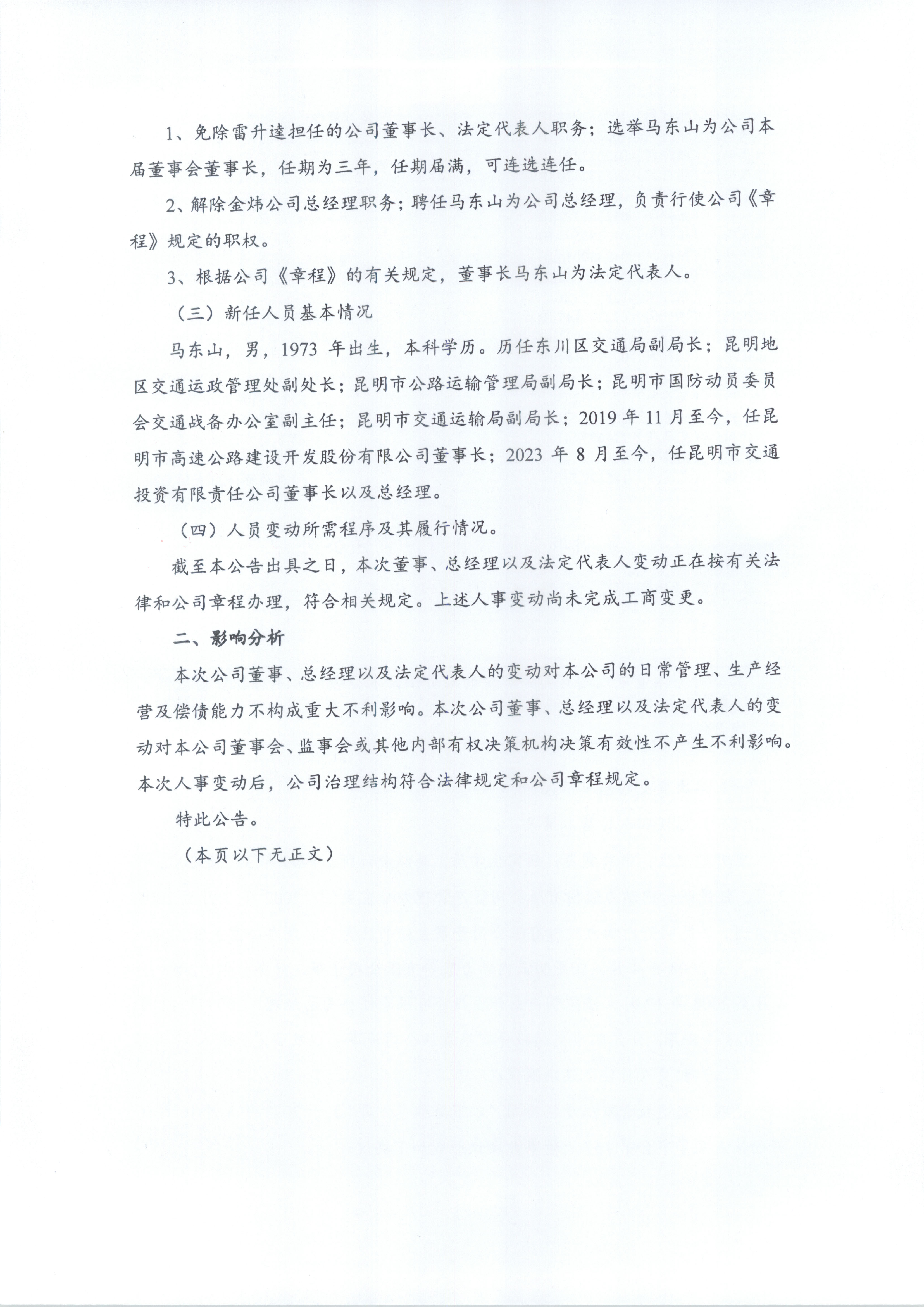 昆明交投公司董事、总经理以及法定代表人发生变动的公告