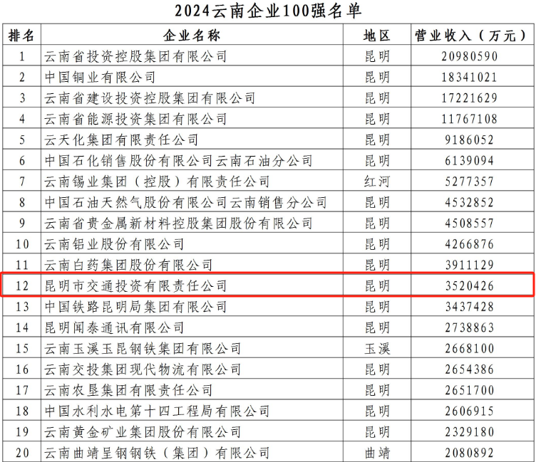11月22日,云南省企业联合会、云南省企业家协会正式揭晓2024年“云南企业100强”及 “云南服务业企业50强” 榜单。昆明交投公司在“云南企业100强”中荣列第12位,在“云南服务业企业50强”中,也取得第5名的优异成绩。