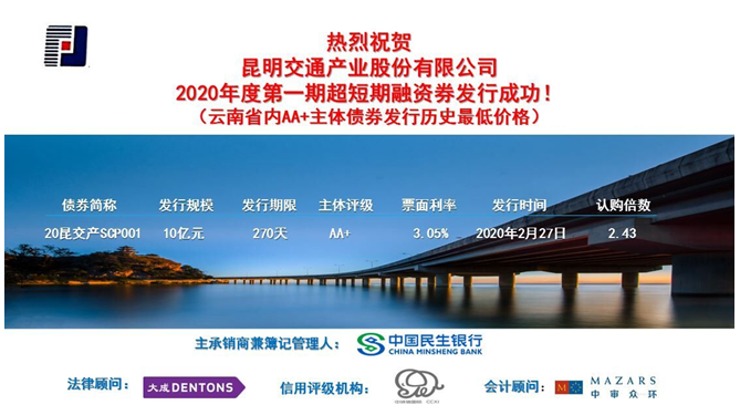 020年2月27日,昆明交投公司下属昆明交通产业股份有限公司(以下简称“交产股份”)成功发行10亿元超短融。期限270天,利率3.05%。本期超短融的发行创云南省内AA+主体债券发行历史最低价格。 本次10亿超短融的成功发...