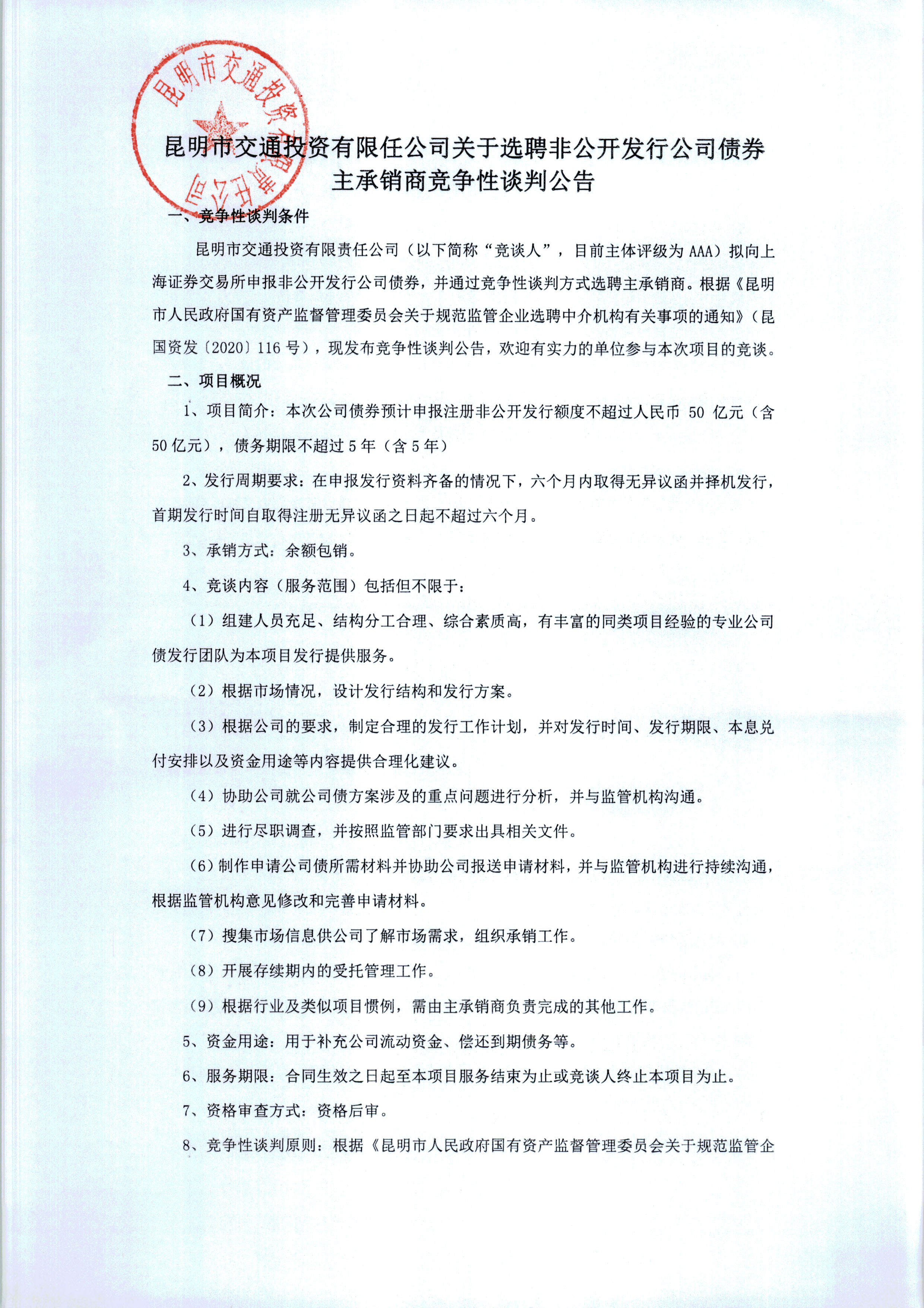 关于选聘非公开发行公司债券主承销商竞争性谈判公告