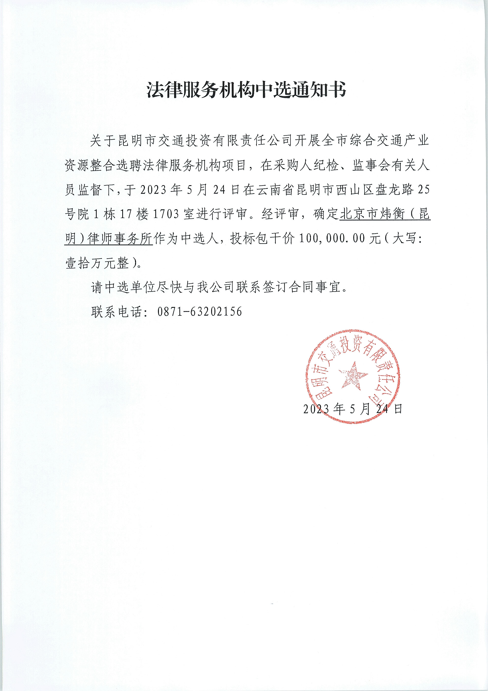 昆明市交通投资有限责任公司及下属公司投资后评价咨询服务项目竞争性谈判结果公示 昆明市交通投资有限责任公司及下属公司投资后评价咨询服务项目竞争性谈判工作在相关部门的监督下,于2023年6月21日下午14:30...
